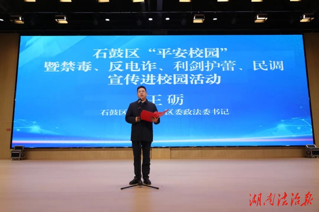 ?湖南法治報訊(通訊員 汪勛 趙彬伶)為進一步深化平安石鼓建設(shè),筑牢校園安全屏障,10月23日下午,2025年石鼓區(qū)“平安校園”暨禁毒、反電詐、利劍護蕾、民調(diào)宣傳進校園活動在石鼓華僑城成章實驗中學隆重舉行。區(qū)委常委、區(qū)委政法委書記王礪出席并講話,區(qū)政府副區(qū)長、區(qū)公安分局局長何玉竹主持,與現(xiàn)場近千名師生共同參與了這場內(nèi)容豐富、意義深遠的安全教育“公開課”。